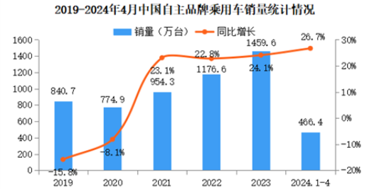 2024年1-4月,中國(guó)品牌乘用車共銷售466.4萬(wàn)輛,同比增長(zhǎng)26.7%,占乘用車銷售總量的60.7%,占有率比上年同期提升7.7個(gè)百分點(diǎn)。