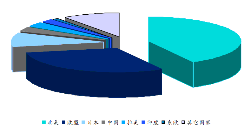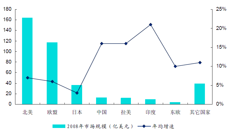 根據(jù)分析師市場報告,2008年北美、歐盟、日本占據(jù)著全球體外診斷市場份額的80%以上,市場分布不均,雖然我國體外診斷市場得到一定的發(fā)展,但是僅占全球市場份額的3%,且人均使用量僅為1.5美元,較發(fā)達國家人均使用量的25-30美元還具有很大的成長空間。