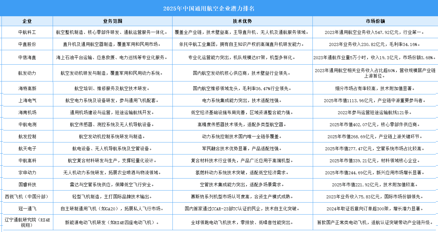 通用航空是指除軍事、警務、海關緝私飛行和公共航空運輸以外的航空活動,涵蓋工業(yè)、農(nóng)業(yè)、林業(yè)、礦業(yè)、建筑業(yè)的作業(yè)飛行,以及醫(yī)療救援、搶險救災、氣象探測、旅游觀光、飛行培訓等領域。通用航空的分類通常包括公務航空、私人航空、無人機應用、航空作業(yè)等,是低空經(jīng)濟的重要組成部分。中國通用航空企業(yè)呈現(xiàn)“制造端集中、運營端分散”的特征,頭部企業(yè)如中航科工、中直股份、中信海直在技術與規(guī)模上領先,而區(qū)域集群(華東、華北)和細分賽道(零部件、短途運輸)則孕育差異化機會。