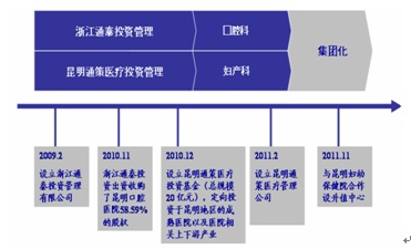 通策的定位不僅僅是口腔領(lǐng)域,而是大型的醫(yī)院投資管理集團(tuán),目前公司旗下主要通過浙江通泰投資及昆明通策醫(yī)療投資進(jìn)行擴(kuò)張,在口腔主業(yè)的基礎(chǔ)上,抓住新醫(yī)改契機(jī)(昆明為國家醫(yī)改試點(diǎn)),積極向婦幼等其他?祁I(lǐng)域拓展,有望打造我國綜合領(lǐng)域的醫(yī)院產(chǎn)業(yè)集團(tuán)。