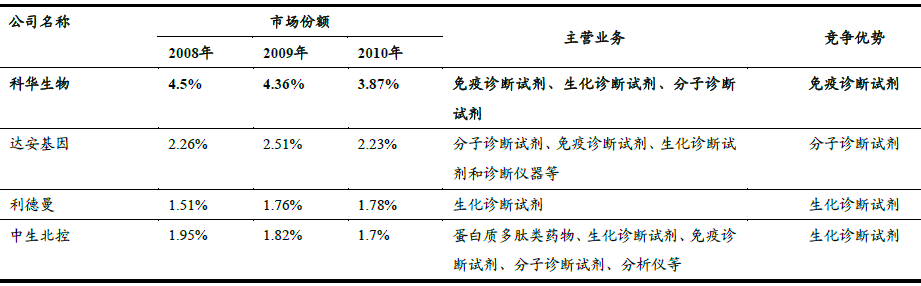 表 2008-2010 年體外診斷試劑行業(yè)內(nèi)主要廠家市場份額及競爭優(yōu)勢