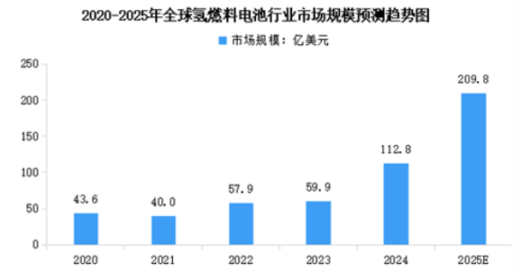 由于氫能具有熱值高、零碳排放等優(yōu)點(diǎn),氫燃料電池可作為理想的發(fā)電裝置。近年來,全球氫燃料電池行業(yè)市場規(guī)?焖僭鲩L, 2024年全球氫燃料電池行業(yè)市場規(guī)模已達(dá)到112.8億美元,自2020年起以26.83%的復(fù)合年增長率增長。2025年全球氫燃料電池行業(yè)市場規(guī)模將達(dá)到209.8億美元。