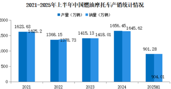 6月,全行業(yè)完成燃油摩托車產(chǎn)銷161.47萬輛和161.83萬輛,環(huán)比增長1.77%和0.53%,同比增長8.83%和8.61%。上半年,全行業(yè)完成燃油摩托車產(chǎn)銷901.28萬輛和904.01萬輛,同比增長14.14%和14.67%。