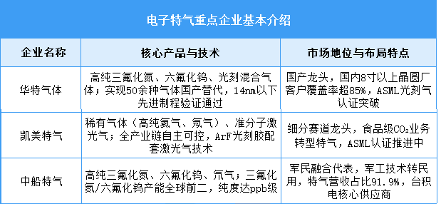中國電子特氣行業(yè)形成差異化格局,核心特點有三:技術(shù)聚焦光刻氣、高純摻雜氣體等高端制程突破,國產(chǎn)化進程在半導(dǎo)體制造、光伏及面板領(lǐng)域加速替代進口并打入全球供應(yīng)鏈,產(chǎn)能布局向含氟特氣全球領(lǐng)先和軍民融合等多領(lǐng)域協(xié)同拓展,呈現(xiàn)“高端突破-國產(chǎn)替代-多場景支撐”的一體化發(fā)展體系。