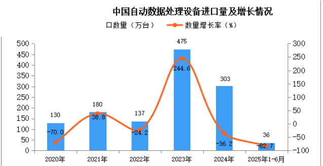 2024年中國(guó)自動(dòng)數(shù)據(jù)處理設(shè)備進(jìn)口量303萬(wàn)臺(tái),同比下降36.2%。最新數(shù)據(jù)顯示,2025年1-6月中國(guó)自動(dòng)數(shù)據(jù)處理設(shè)備進(jìn)口量36萬(wàn)臺(tái),同比下降82.7%。