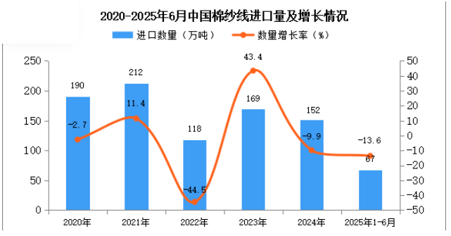 2024年中國棉紗線進(jìn)口量152萬噸,同比下降9.9%。最新數(shù)據(jù)顯示,2025年1-6月中國棉紗線進(jìn)口量67萬噸,同比下降13.6%。
