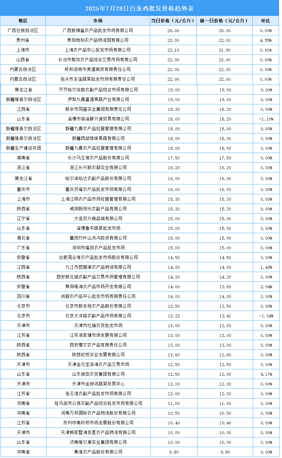 7月28日全國白條雞平均價格為16.16元/公斤。其中,白條雞價格最高的市場是廣西新柳邕農(nóng)產(chǎn)品批發(fā)市場有限公司,當日價格為26.00元/公斤,環(huán)比持平。白條雞價格最低的市場是黃淮農(nóng)產(chǎn)品股份有限公司,當日價格為9.80元/公斤,環(huán)比持平。