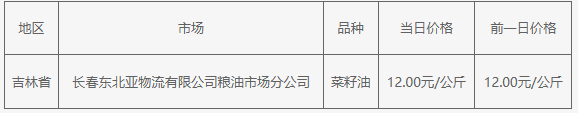對(duì)2025年7月28日吉林省菜籽油批發(fā)市場(chǎng)價(jià)格最新行情監(jiān)測(cè)顯示:2025年7月28日吉林省菜籽油批發(fā)價(jià)格均價(jià)12元/公斤,昨日均價(jià)12元/公斤,今日價(jià)格較昨日上漲0元/公斤不等,比昨日漲幅0%。