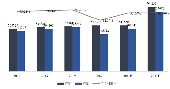2020年我國受疫情影響較小,但受困于全球需求萎靡,產(chǎn)量也有很大幅度的縮水。但相對于全球77%的產(chǎn)能利用率,我國在占全球絕大部分產(chǎn)能產(chǎn)量的情況下還能保持81.09%的產(chǎn)能利用率。