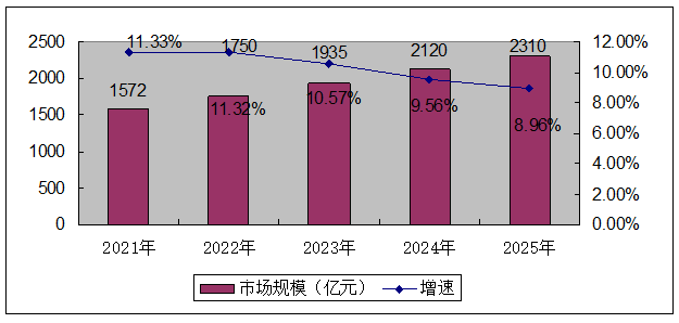 預(yù)計到2025年我國信息安全規(guī)模達到2310億元。2020-2025年復(fù)合增長率達到10.35%。