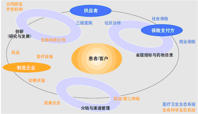 我們所定義的生命科學市場廣泛地涵蓋了整個醫(yī)療衛(wèi)生生態(tài)系統(tǒng)和生命科學生態(tài)系統(tǒng)中的主要企業(yè)(組織),如下圖所示。這些企業(yè)在醫(yī)療領域從事與藥品、醫(yī)療設備和診斷檢驗等內容相關的經營活動,貫穿創(chuàng)新(R&D)、制造、營銷和分銷全過程,最終致力于為患者和消費者提供更好的醫(yī)療衛(wèi)生服務。當其他產業(yè)增速放緩時,中國的生命科學市場無疑是全球經濟中的一個亮點。中國醫(yī)藥市場因其巨大的發(fā)展?jié)摿Χ妒荜P注。預計2020年中國有望以2200億美元的市場規(guī)模,成為僅次于美國的全球第二大醫(yī)藥市場。中國當前的醫(yī)療衛(wèi)生改革和政府建立更具創(chuàng)新性和競爭力產業(yè)的舉措,將促進中國生命科學市場的蓬勃發(fā)展。當企業(yè)置身于更有序、更規(guī)范的市場環(huán)境,需以更好地滿足患者需求為己任,并逐步成為全球市場的領跑者。
